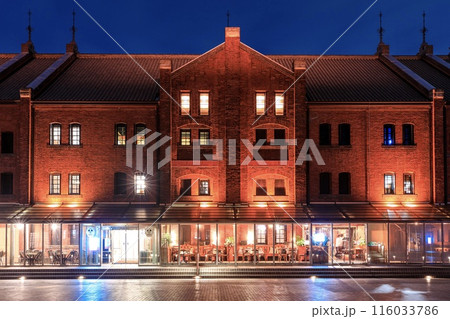 横浜市、横浜赤レンガ倉庫のライトアップ(建物正面)