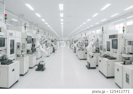 半導体製造工場のクリーンルームと最新鋭設備の整列