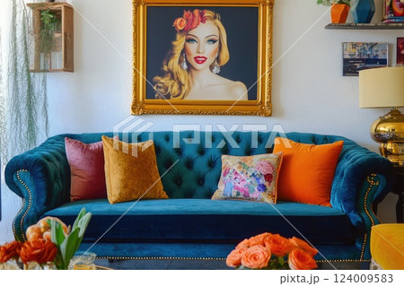 An eclectic living room with teal velvet sofa