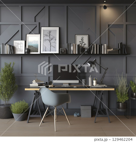 Modern office space featuring minimalist desk, shelf with books, and dark gray walls evokes calm and focused atmosphere