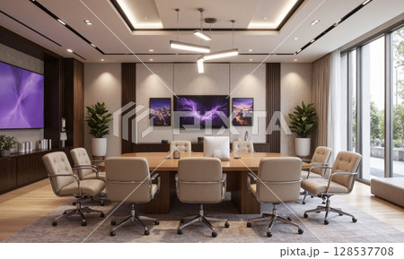 High-end boardroom with AI assistants, premium ergonomic seating, and a sophisticated design. The boardroom includes a polished wooden conference table, sleek leather chairs,