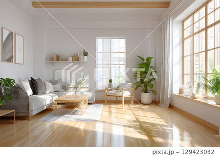 Minimal Scandinavian living room interior with natural light and empty space for text, ideal for real estate ads or website banners.