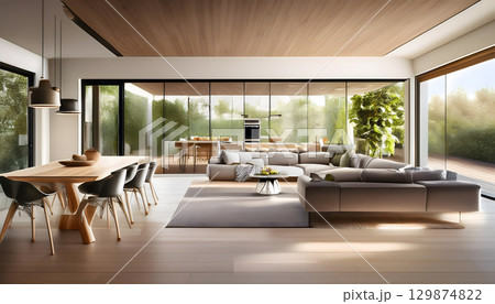 Spacious modern living room with large windows, white walls, stylish furniture. Bright interior with natural light