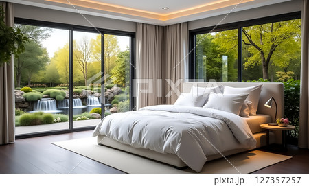 Cozy bedroom with serene garden view featuring lush greenery and tranquil waterfalls during the daytime