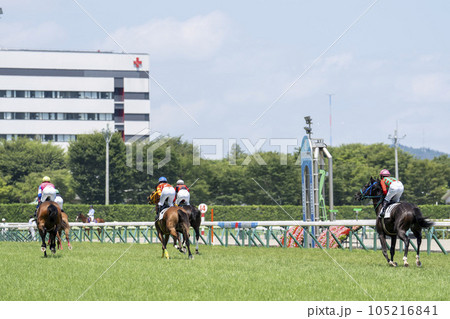 夏の競馬場 返し馬の風景 馬の後ろ姿 福島県福島市