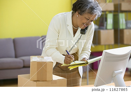 Mature woman on phone looking at computer screen and writing on legal pad