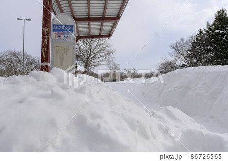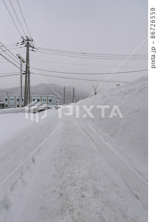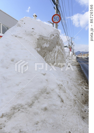 大雪で排雪が進まない路肩(高く積まれた雪山)