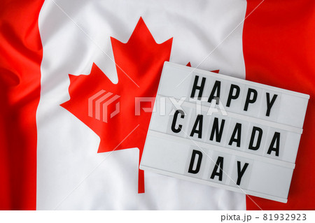 The National Flag of Canada. Lightbox with text HAPPY CANADA DAY Canadian Flag or the Maple Leaf. Patriotism. International relations concept. Independence day