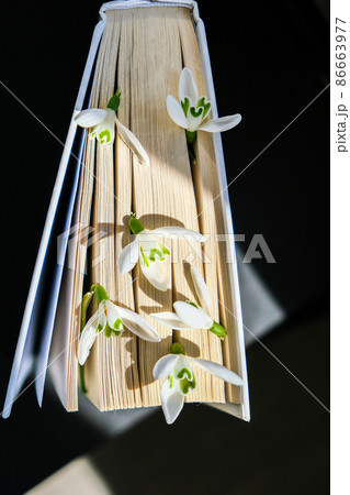 Snowdrop flowers on an old book. Early First spring flowers. Hello Spring. Still life with a book. Galanthus among pages of book.