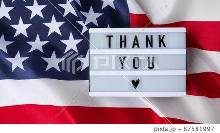 American flag. Lightbox with text THANK YOU Flag of the united states of America. July 4th Independence Day. USA patriotism national holiday. Usa proud.