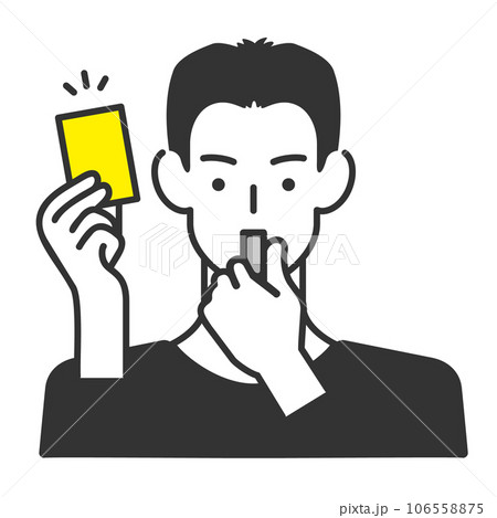 レッドカードとイエローカードを出す男性と女性の審判が横からひょっこりと出ているイメージのイラスト素材