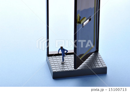 開いたドアから走り出る男性の後ろ姿のシルエット