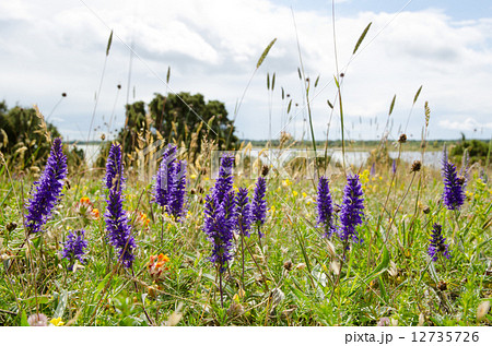 Pink flowers of blooming Purple Loosestrife Lythrum salicaria on the shoreline