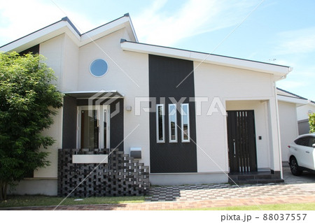 片流れ屋根のモノクロでシックでモダンでスタイリッシュで丸窓がある透かし積みの塀が美しい邸宅