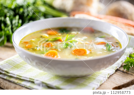 Spring vegetable soup with chopped and grated root vegetables, seasoned with yeast. Healthy vegetable vegetarian food