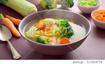 A bowl of vegetable soup with carrots, broccoli, and peas