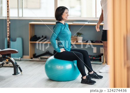 スポーツジムに通いバランスボールで体幹を鍛える女性