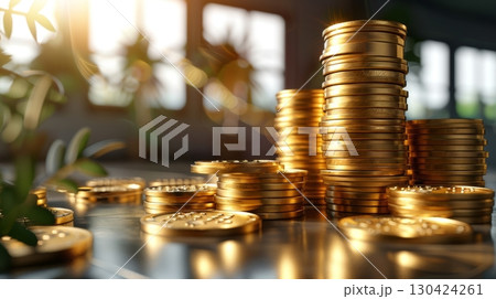 Close up view of a stack of gold coins on an office desk, symbolizing financial wealth