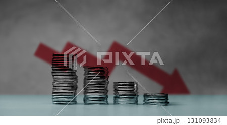 Downward red arrow with shrinking stacks of coins, depicting global recession, economic downturn, and significant financial loss.