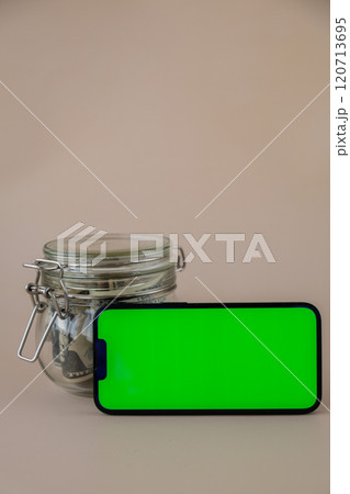 Chrome key smartphone screen mock up template in horizontal position on beige background. Copy space App website advertising. Jar filled with dollars cash. Concept of Mobile application and technology