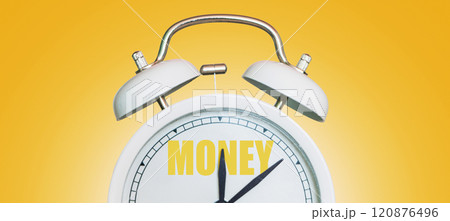Time for money. White vintage clock pointing to Money on a yellow background