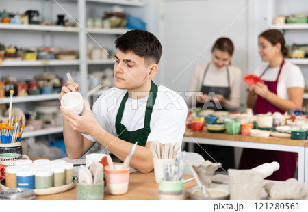Young man painting pottery in workshop