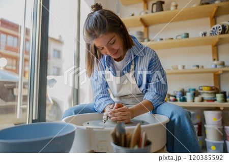 Potter hands apply flower paint to ceramic plates, making artistic pattern design in store workshop