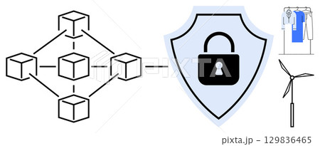 Blockchain network diagram connecting to shield with padlock wind turbine and clothing on hangers in background. Ideal for cybersecurity, renewable energy, supply chain, technology integration