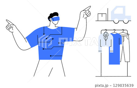 Man using VR glasses pointing at virtual elements. Clothing on hangers, truck, and package visualized around him. Ideal for e-commerce, VR, technology, fashion retail, virtual shopping delivery