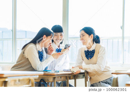 学校の教室でスマホを使う女子高生