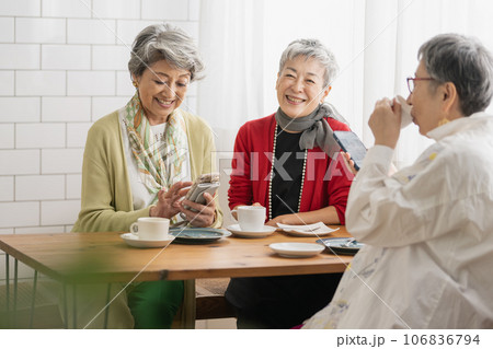 カフェでお茶をするシニア仲間・スマホを見るシニアの女性たち