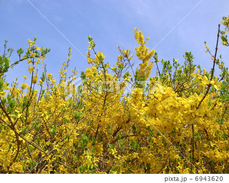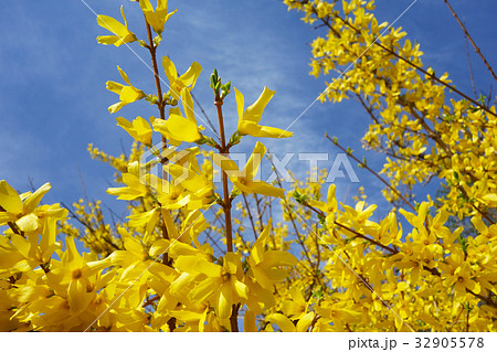 青空と黄色のレンギョウの花
