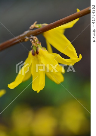 早春の花の背景素材・鮮やかな黄色の花を付けて花枝を伸ばすレンギョウ・縦位置