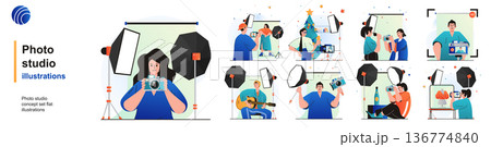 Photo studio isolated set. Photographers make professional photo session. People collection of scenes in flat design. Vector illustration for blogging, website, mobile app, promotional materials.