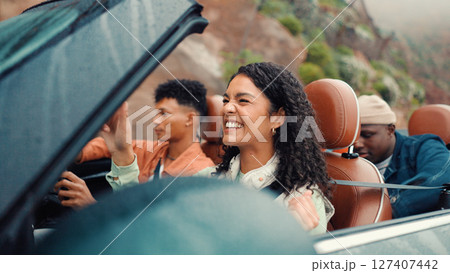 Drive, energy and road trip with happy friends in car together for holiday, travel or vacation. Dance, excited and smile with group of people riding in convertible vehicle for weekend getaway