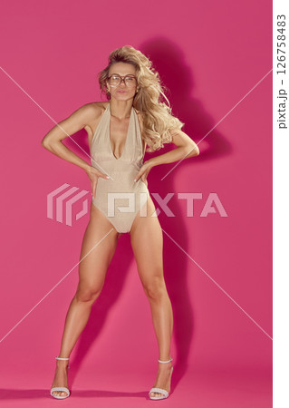 Woman in beige swimsuit stands confidently with hands on hips and intense look against pink studio background