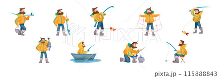 Bearded Fisherman Capturing Fish with Rod in Pond Vector Set
