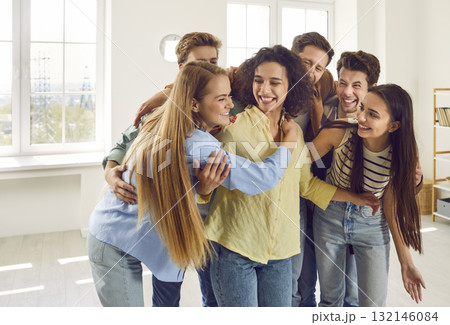 Group of happy friends hugging indoors and enjoying spending time together.