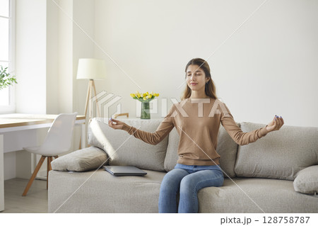 Girl resting on comfortable sofa meditates enjoying stress-free peaceful weekend without stress.