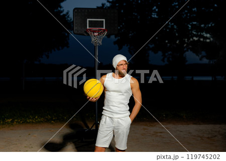 Man holding a basketball in a park at dusk, showcasing athleticism and confidence by the court under a darkening sky