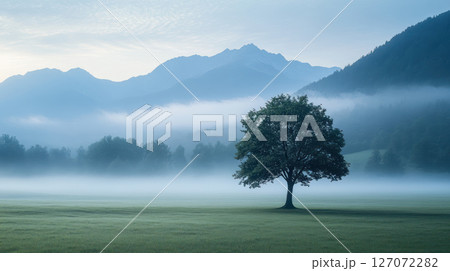 Peaceful landscape with foggy mountains and single tree in foreground creating calm and serene atmosphere in nature