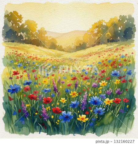 Watercolor Painting of a Meadow with Colorful Wildflowers