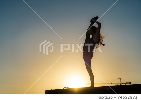 Flexible female dancer on the edge of rooftop on the dramatic sky background during sunset . Concept of healthy lifestyle, talent and aspiration