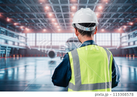 飛行機の格納庫で作業をする男性