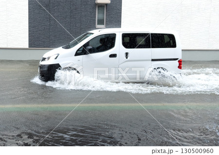 冠水した道路で車が水しぶきを上げながら走行する様子