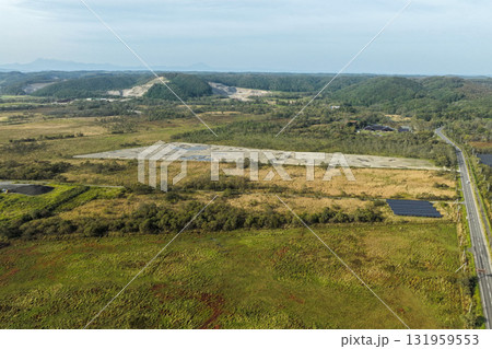北海道・釧路湿原周辺で造成が進む開発エリアと自然環境を俯瞰で撮影した空撮風景