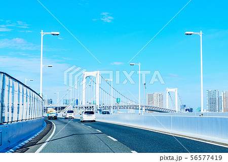 [交通イメージ] 夏休みに首都高速を走行しレインボーブリッジを通って千葉から東京都心を目指すシーン