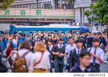 日本の東京都市景観ハロ本番。混雑する渋谷駅・高架下の歩道。夜は通行規制がかかる。奥は宮益坂下=31日