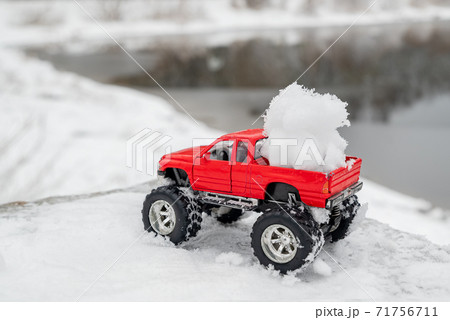 Red toy pickup truck carries fluffy snowball in its back. Winter outdoor fun activities