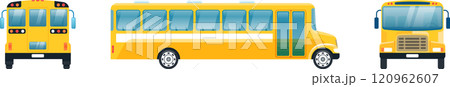 Yellow school bus viewed from different angles, including front, side, and back, showcasing its design and features for transporting students
